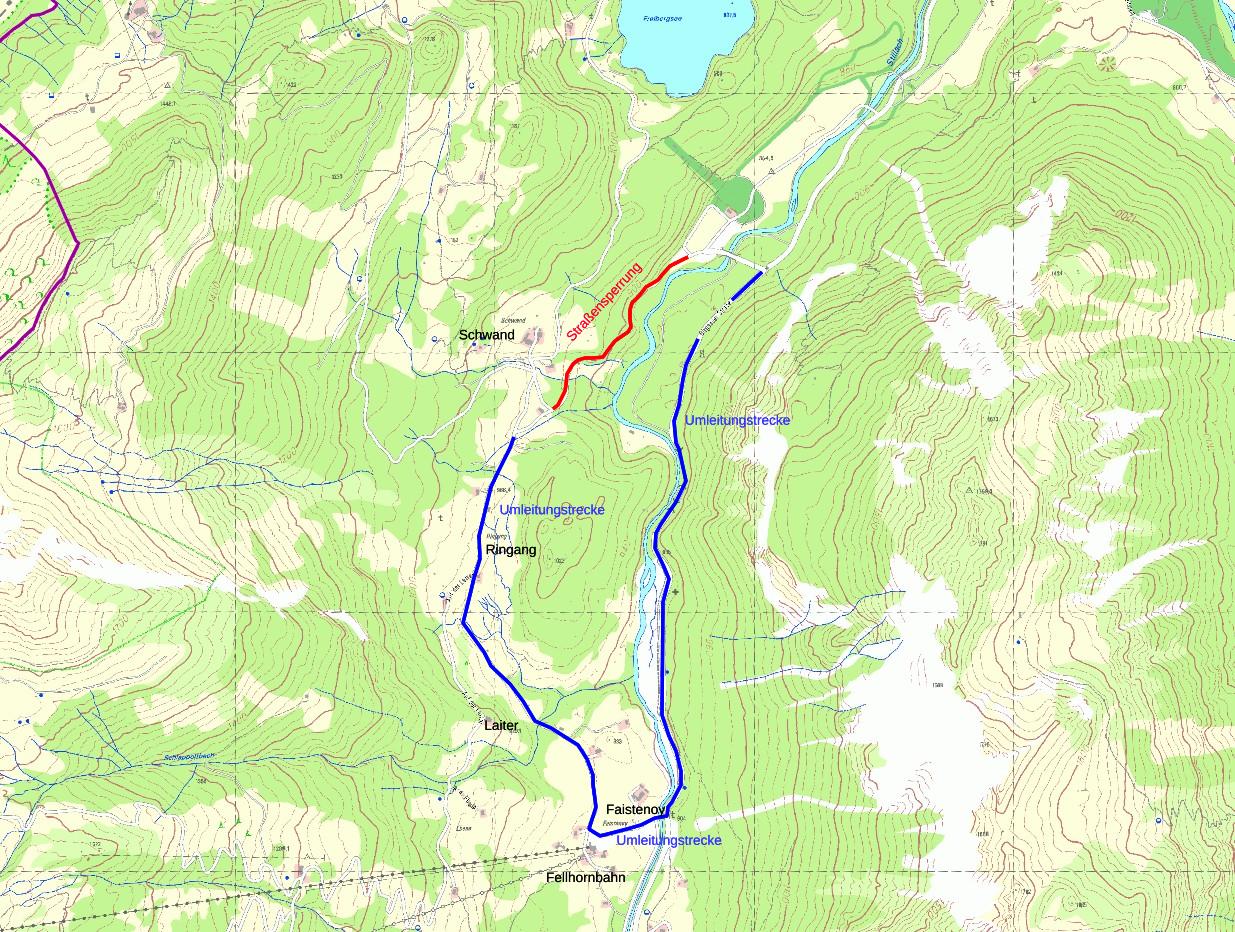 Die Umleitungstrecke führt über Faistenoy/Ringang, siehe Übersichtsplan.