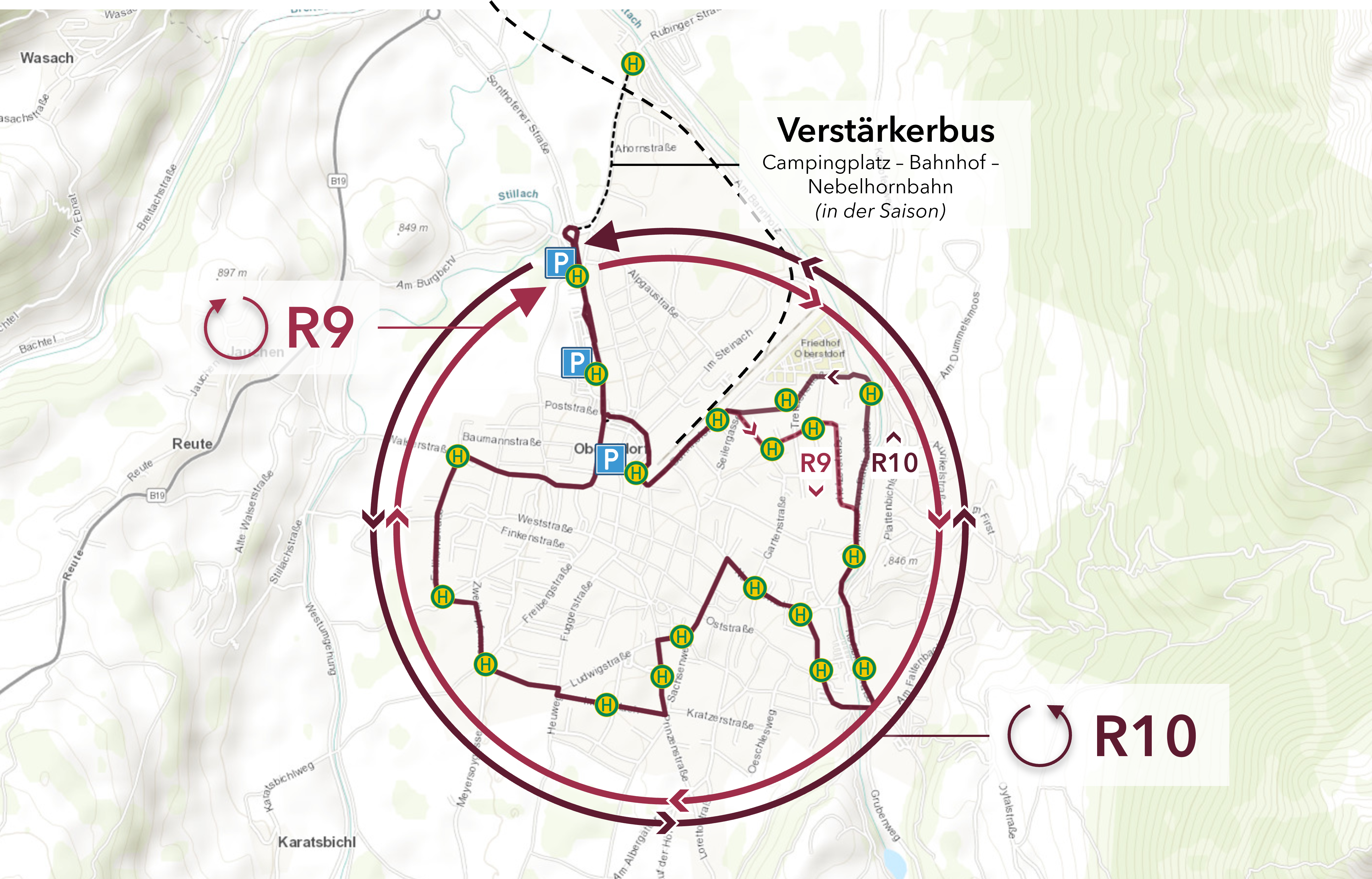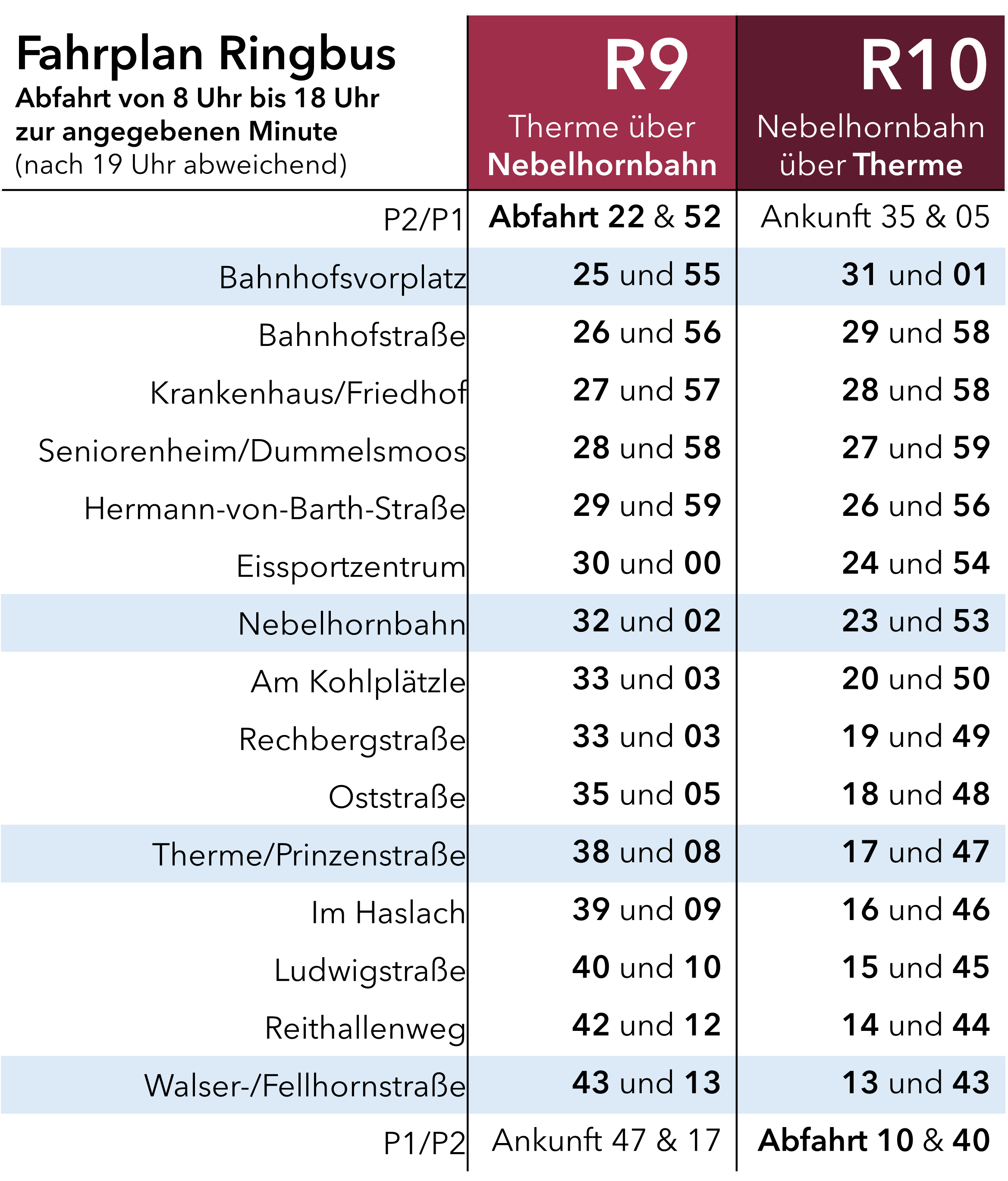 Die beiden Ringbus-Linien verkehren täglich von 8 bis 18 Uhr im 30-Minuten-Takt – passend zur ersten Fahrt der Nebelhornbahn. In der Saison wird der Abschnitt P1 – Bahnhof – Nebelhornbahn zu einem 15-Minuten-Takt verdichtet, mit Fahrten, die bereits am Campingplatz/Rubingerstraße beginnen. Zusätzlich sorgen Spätfahrten bis nach 21 Uhr dafür, dass auch die Betriebszeiten der Therme optimal abgedeckt sind.