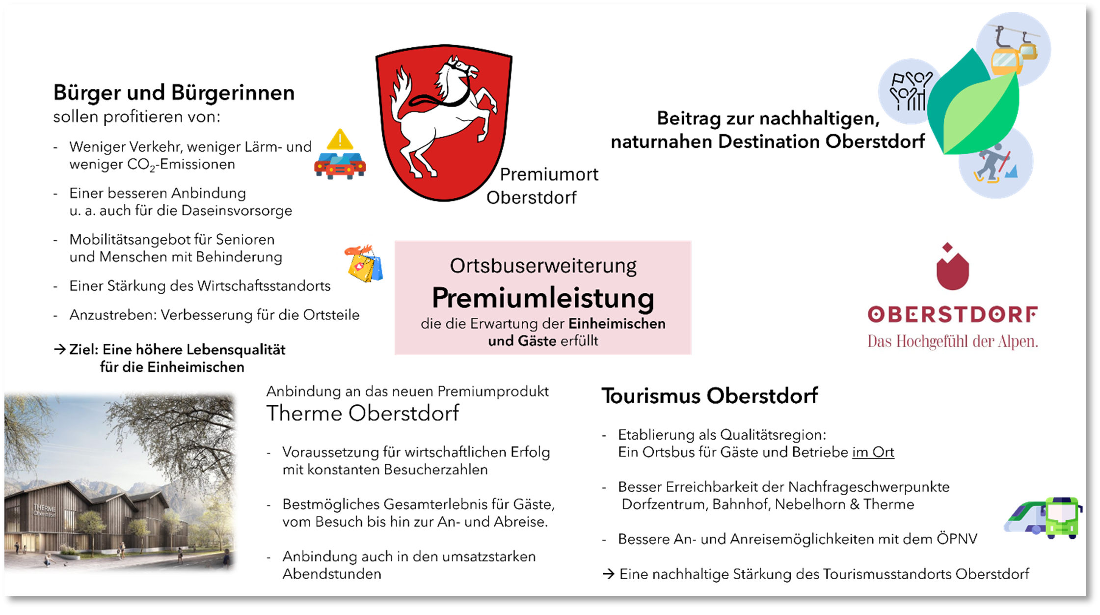 Das neue Ringbussystem dient als Trägersystem für zukünftige Entwicklungen in der Gemeinde Oberstdorf. Bei künftigen Entwicklungskonzepten kann man auf diesem neuen Bussystem aufbauen und sein volles Potenzial durch weitere Anpassungen im Ort anheben.