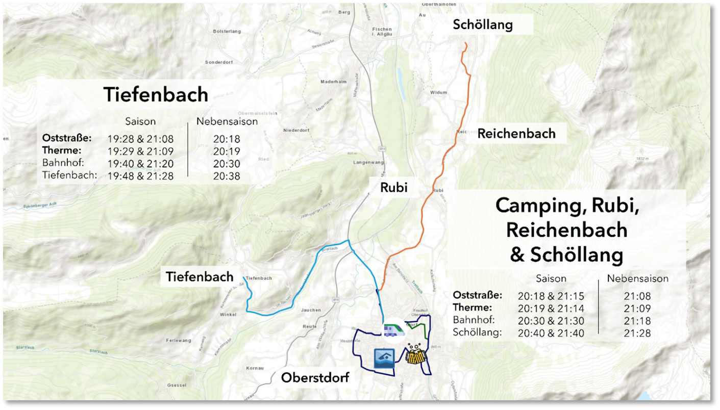Hinzu kommt, dass das Angebot in der Saison zwischen P1 – Bahnhof – Nebelhornbahn auf einen 15-Minuten-Takt in Lastrichtung (Vormittag Richtung Nebelhornbahn, Nachmittag in Gegenrichtung) verstärkt wird. Diese Verstärkerfahrten beginnen bzw. enden an der Rubinger Straße, wodurch zusätzlich noch die Campingplätze und Gastgeber in diesem Bereich attraktiv angebunden werden.